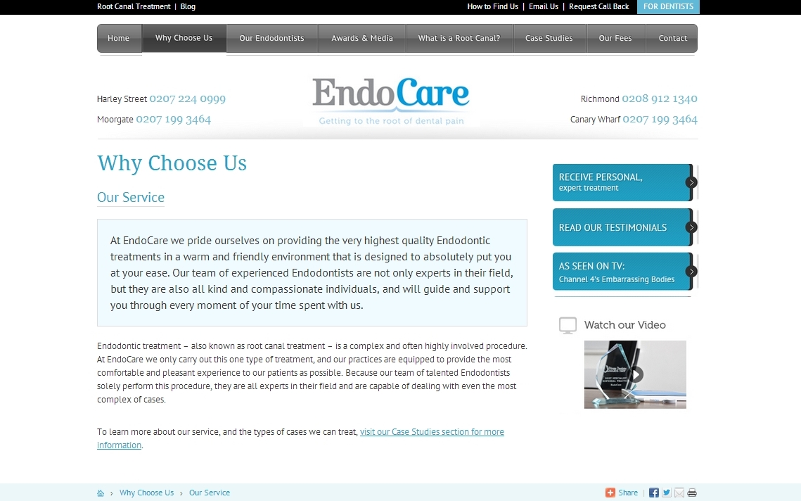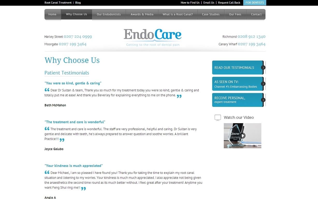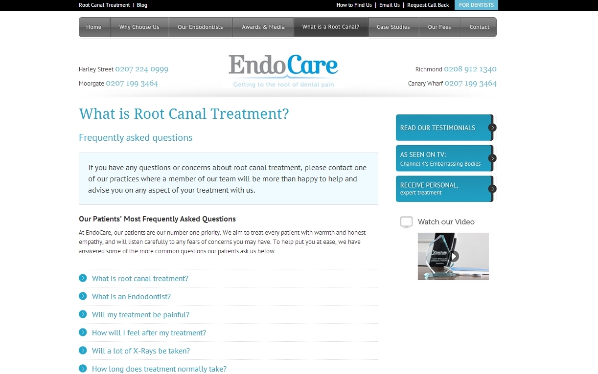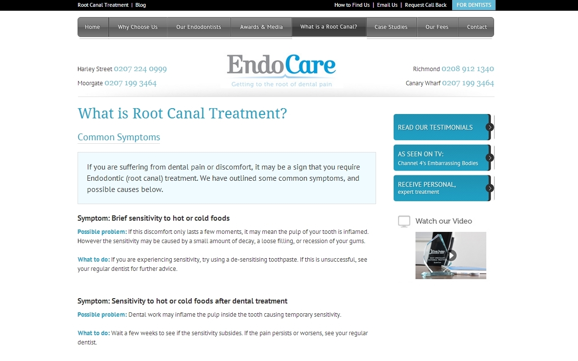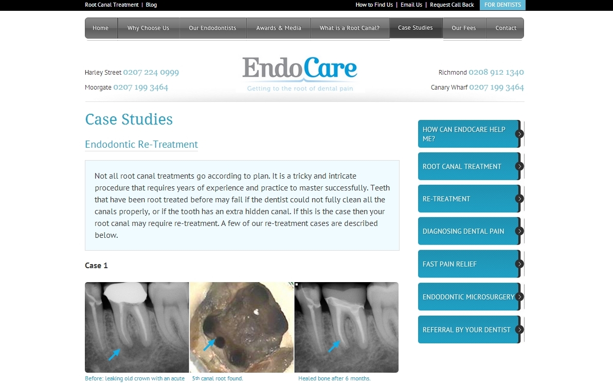In the first quarter of 2013 I completed work re-writing content for EndoCare – a group of dental practices that offer high quality endodontic treatments in locations across London. My work included proofing and re-writing almost all web content including treatment descriptions, FAQs and mini case studies. I also liaised with the web design company to ensure updates were made in a swift and timely manner. This work required acute attention to detail, a patient-centred approach, and a good understanding of the EndoCare ‘brand’.
